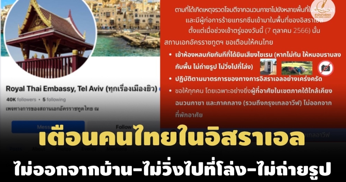 สถานเอกอัครราชทูตเทลอาวีฟ ประกาศเตือนคนไทยในอิสราเอล ไม่ออกจากบ้าน-ไม่วิ่งไปที่โล่ง-ไม่ถ่ายรูป หลังผู้ก่อการร้ายยิงจรวดโจมตีหลายพื้นที่