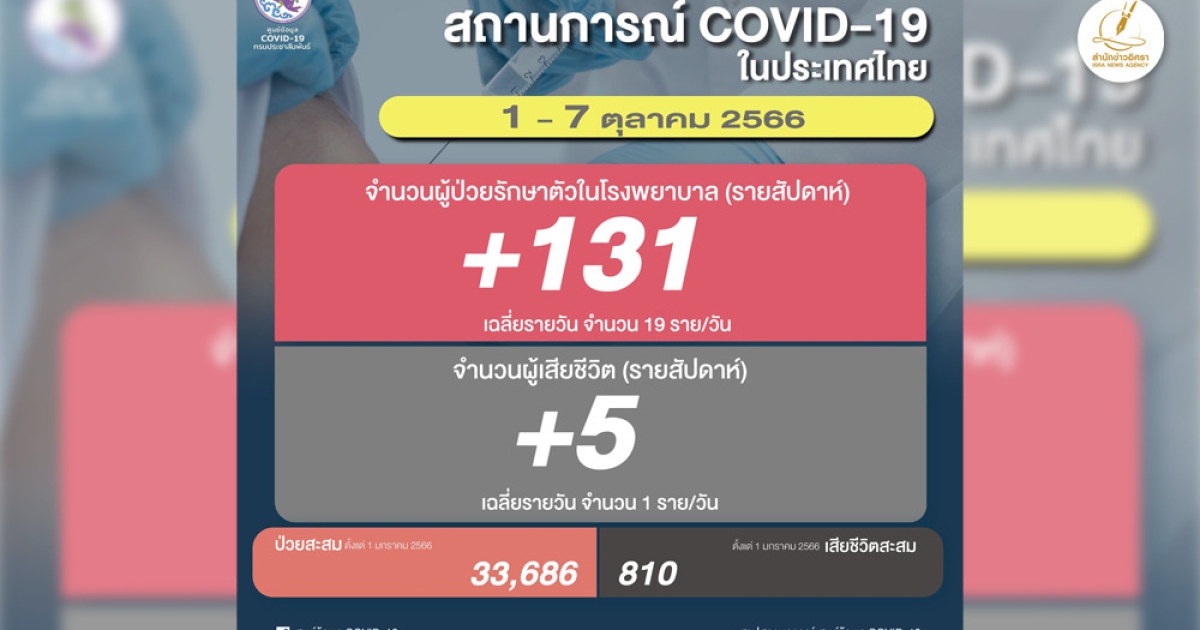 สำนักข่าวอิศรา (www.isranews.org) รายงานสถานการณ์แพร่ระบาดของโรคโควิด-19 ประเทศไทย ประจำสัปดาห์ ระหว่างวันที่ 1 - 7 ต.ค. 2566 มีจำนวนผู้ติดเชื้อใหม่เข้ารักษาตัวโรงพยาบาล 131 ราย เฉลี่ยวันละ 19 ราย ทำให้จำนวนผู้ติดเชื้อสะสมอยู่ที่ 33,686 ราย (ตั้งแต่ 1 ม.ค. 2566)