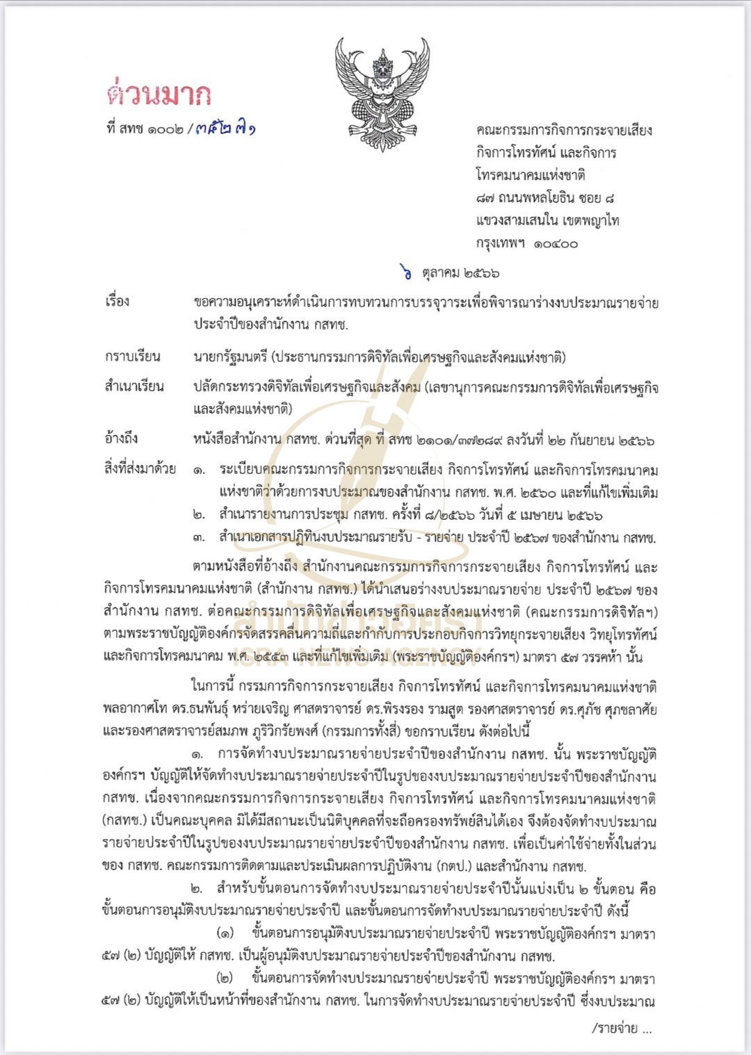 เพื่อให้สำนักงาน กสทช. ดำเนินการให้เป็นไปตามขั้นตอนการจัดทำงบประมาณที่ กสทช. ได้มีมติแล้วในครั้งที่ 8/2566 เมื่อวันที่ 5 เม.ย.2566 ตลอดจนกฎหมาย ระเบียบ และข้อบังคับ ที่เกี่ยวข้องให้ครบถ้วนก่อนนำเสนอคณะกรรมการดิจิทัลฯ เพื่อกราบเรียนบรรจุวาระการประชุมต่อไป จึงเรียนมาเพื่อโปรดพิจารณาสั่งการ” หนังสือด่วนมาก ที่ สทช.1002/35271 ลงวันที่ 6 ต.ค.2566 ของกรรมการ กสทช. ทั้ง 4 ราย ที่ส่งไปยังนายกฯ ระบุ