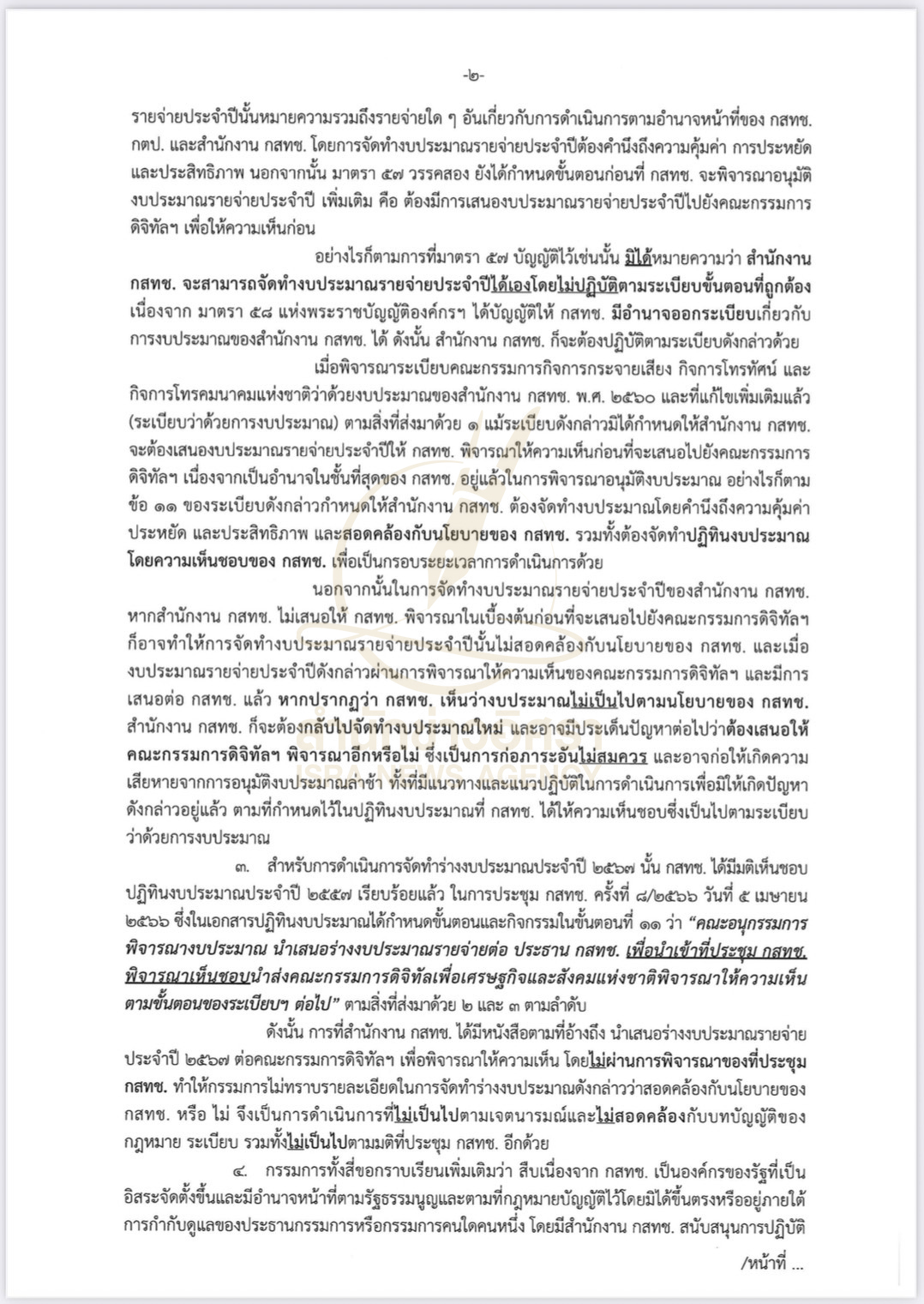 ดังนั้น การที่สำนักงาน กสทช. ได้มีหนังสือตามที่อ้างถึง นำเสนอร่างงบประมาณรายจ่าย ประจำปี 2567 ต่อคณะกรรมการดิจิทัลฯ เพื่อพิจารณาให้ความเห็น โดยไม่ผ่านการพิจารณาของที่ประชุมกสทช. ทำให้กรรมการไม่ทราบรายละเอียดในการจัดทำร่างงบประมาณดังกล่าวว่าสอดคล้องกับนโยบายของ กสทช. หรือไม่ จึงเป็นการดำเนินการที่ไม่เป็นไปตามเจตนารมณ์และไม่สอดคล้องกับบทบัญญัติของกฎหมาย ระเบียบ รวมทั้งไม่เป็นไปตามมติที่ประชุม กสทช. อีกด้วย
