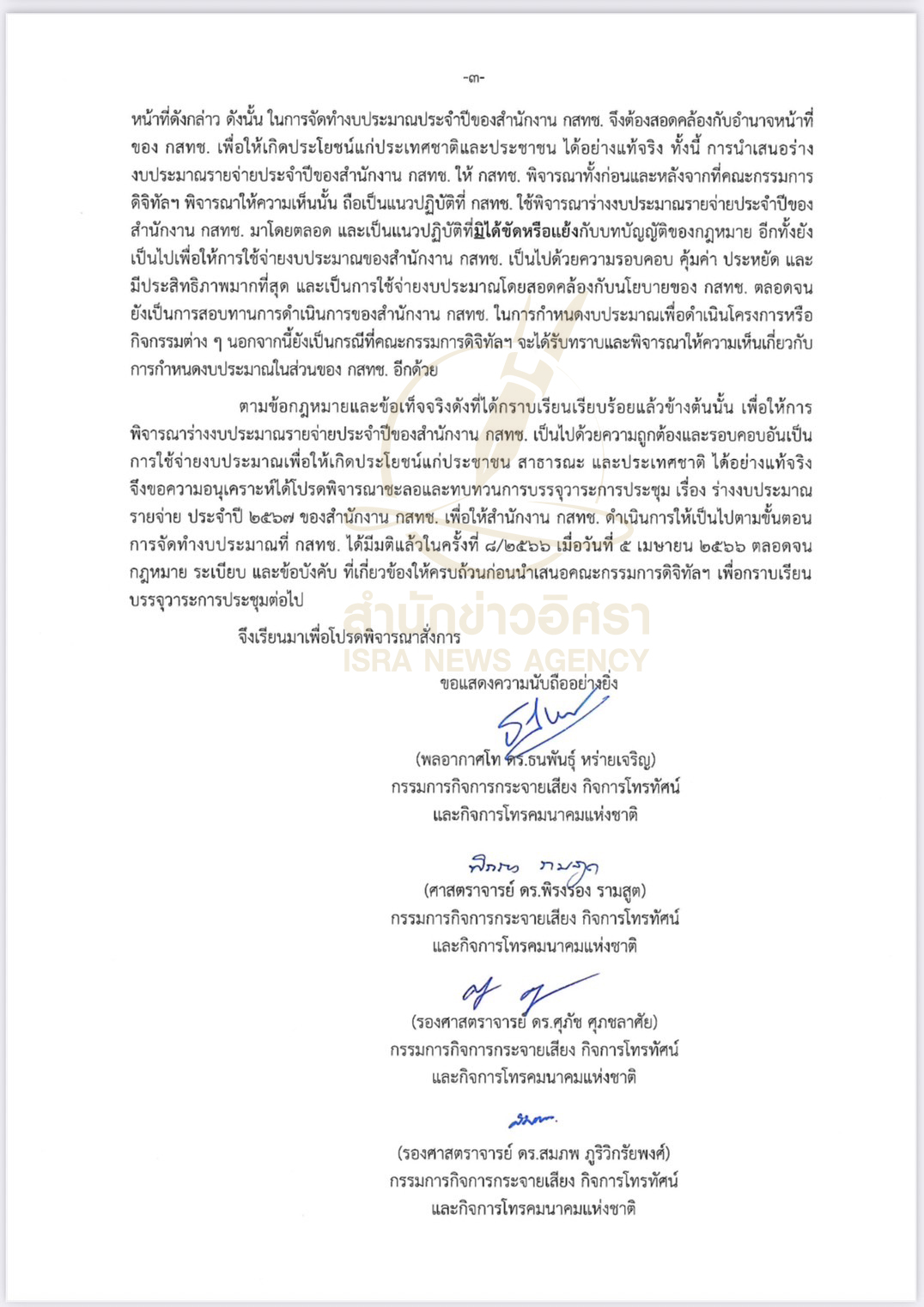 สำนักข่าวอิศรารายงานเพิ่มเติมว่า เมื่อวันที่ 6 ต.ค.2566 กรรมการ กสทช. ทั้ง 4 ราย ได้แก่ พล.อ.ท.ดร.ธนพันธุ์ หร่ายเจริญ ,ศ.ดร.พิรงรอง รามสูต , รศ.ดร.ศุภัช ศุภชลาศัย และ รศ.สมภพ ภูริวิกรัยพงศ์ ร่วมกันทำหนังสือบันทึกข้อความ ถึง ศ.คลินิก นพ.สรณ บุญใบชัยพฤกษ์ ประธาน กสทช. เรื่อง ขอให้ทบทวนการเสนอ เรื่อง การบรรจุวาระต่อคณะกรรมการดิจิทัลเพื่อเศรษฐกิจและสังคมแห่งชาติ เพื่อพิจารณาร่างงบประมาณรายจ่ายประจำปี 2567 ของสำนักงาน กสทช. กรอบวงเงิน 5,282.50 ล้านบาท ด้วย