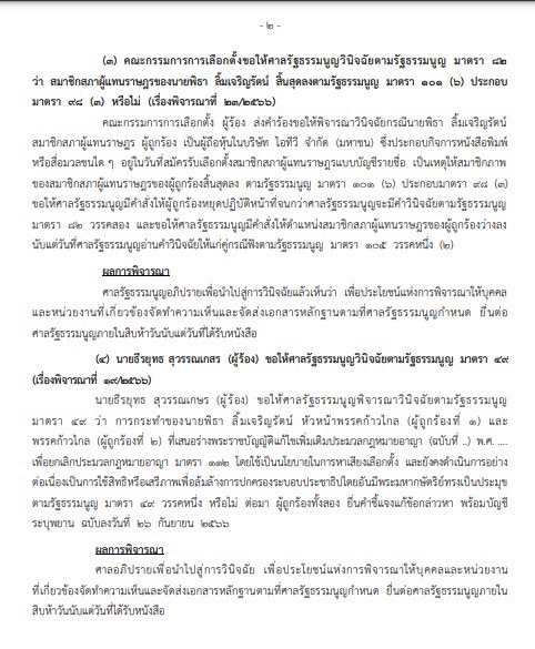 ผลการพิจารณาของศาลได้มีการอภิปรายเพื่อนำไปสู่การวินิจฉัย เพื่อประโยชน์แห่งการพิจารณาให้บุคคลและหน่วยงานที่เกี่ยวข้องจัดทำความเห็นและจัดส่งเอกสารหลักฐานตามที่ศาลรัฐธรรมนูญกำหนด ยื่นต่อศาลรัฐธรรมนูญภายใน 15 วันนับแต่วันที่ได้รับหนังสือ