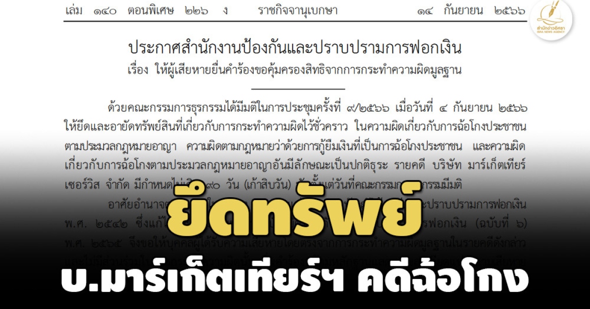 แพร่ประกาศ ปปง.ให้ผู้เสียหายยื่นคำร้องขอคุ้มครองสิทธิจากการกระทำความผิดมูลฐานรายคดี บ.มาร์เก็ตเทียร์ เซอร์วิส หลังคกก.ธุรกรรมสั่งยึดอายัดทรัพย์สิน ฐานฉ้อโกงประชาชน เคยถูก ‘บิ๊กโจ๊ก’ ตร.บก.ปอศ. แถลงจับฐานหลอกลงทุนเก็งอัตราแลกเปลี่ยนเงินต่างประเทศ งบแจ้งงบการเงินแจ้งรายได้ 2,400 บ.