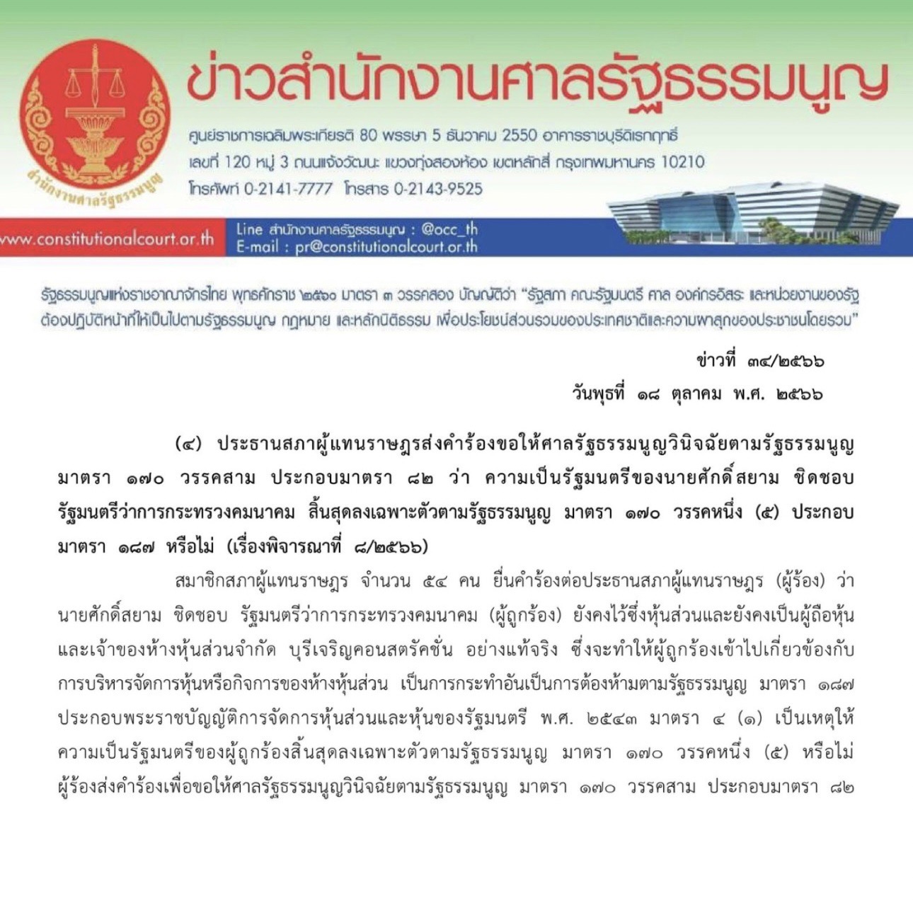 ศาลรัฐธรรมนูญ รอคำชี้แจงหน่วยงานเกี่ยวข้องปม 'พิธา-ก้าวไกล' หาเสียงแก้ ม.112 ล้มล้างการปกครอง /คุณสมบัติ "ศักดิ์สยาม" คดีถือหุ้นบุรีเจริญฯ