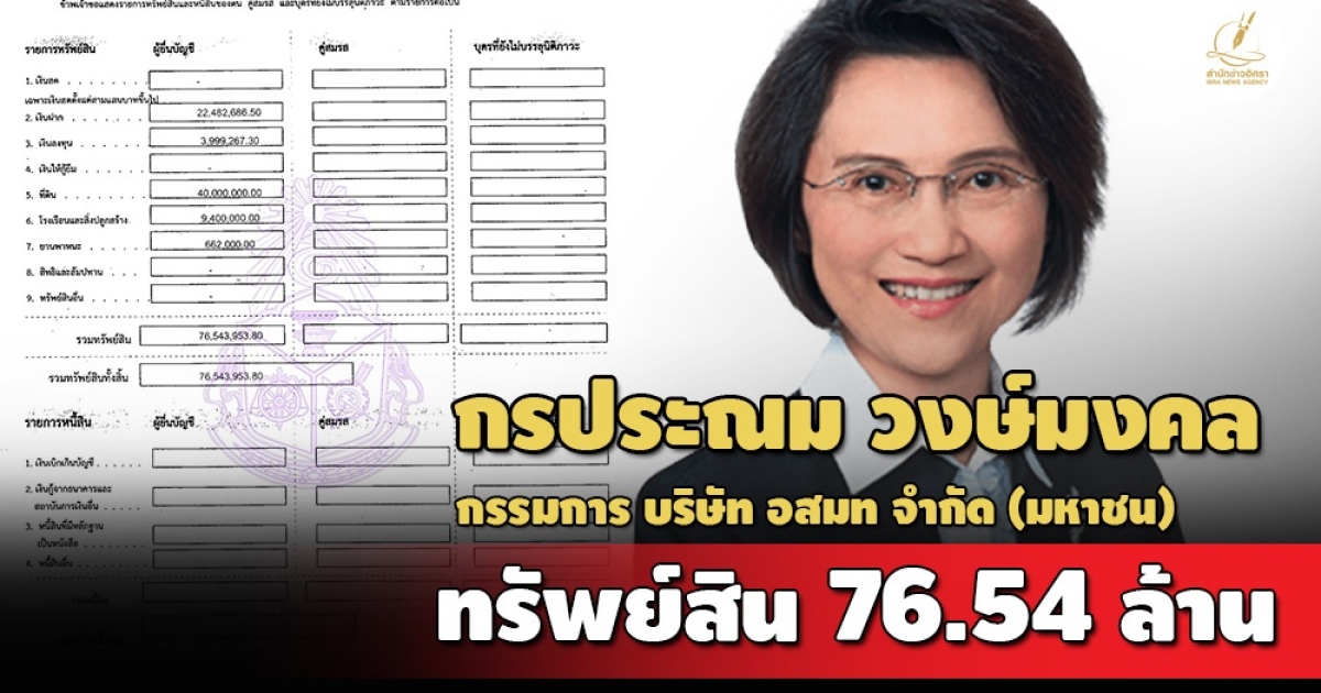 ป.ป.ช.เปิดบัญชีทรัพย์สิน 'กรประณม วงษ์มงคล' กรรมการบริษัท อสมท จำกัด (มหาชน) มีทรัพย์สิน 76 ล้าน มีเงินฝาก 22 ล้าน มีที่ดินในปากช่อง-โคราช รถยนต์ 2 คัน รายได้ 7 แสนต่อปี