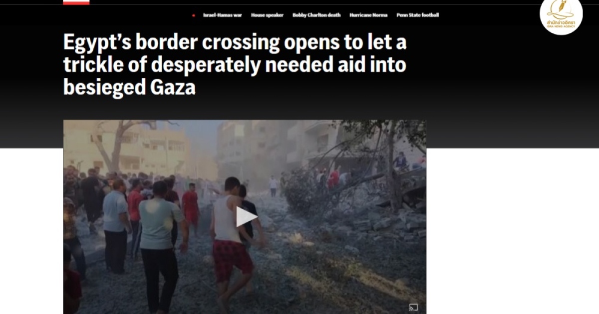สำนักข่าวอิศรา (www.isranews.org) รายงานข่าวสถานการณ์การสู้รบระหว่างอิสราเอลกับกลุ่มฮามาสว่าเมื่อวันที่ 21 ต.ค.ที่ผ่านมา ได้มีการเปิดพรมแดนราฟาห์ซึ่งอยู่ระหว่างประเทศอียิปต์กับฉนวนกาซ่าเพื่อลำเลียงความช่วยเหลือที่จำเป็นอย่างยิ่งไปยังดินแดนปาเลสไตน์ ซึ่งการเปิดพรมแดนนี้ถือเป็นครั้งแรกนับตั้งแต่ที่มีการปิดล้อม