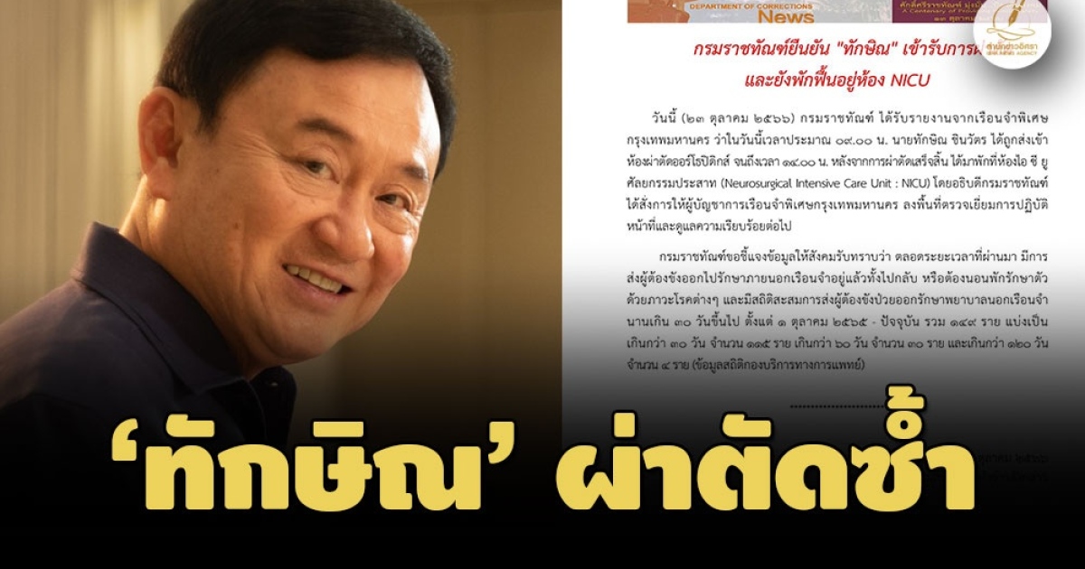 สำนักข่าวอิศรา (www.isranews.org) รายงานว่า เมื่อวันที่ 23 ต.ค. 2566 เฟซบุ๊กประชาสัมพันธ์ กรมราชทัณฑ์ เผยแพร่เอกสารข่าว ยืนยันว่านายทักษิณ ชินวัตร อดีตนายกรัฐมนตรี เข้ารับการผ่าตัด มีรายละเอียด ดังนี้