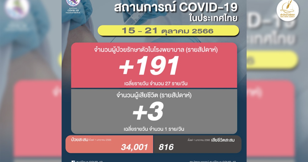 สำนักข่าวอิศรา (www.isranews.org) รายงานสถานการณ์แพร่ระบาดของโรคโควิด-19 ประเทศไทย ประจำสัปดาห์ ระหว่างวันที่ 15 - 21 ต.ค. 2566 มีจำนวนผู้ติดเชื้อใหม่เข้ารักษาตัวโรงพยาบาล 191 ราย เฉลี่ยวันละ 27 ราย ทำให้จำนวนผู้ติดเชื้อสะสมอยู่ที่ 34,001 ราย (ตั้งแต่ 1 ม.ค. 2566) ส่วนผู้เสียชีวิตเพิ่มรายสัปดาห์ 3 ราย เฉลี่ยวันละ 1 ราย เสียชีวิตสะสม 816 ราย (ตั้งแต่ 1 ม.ค. 2566)