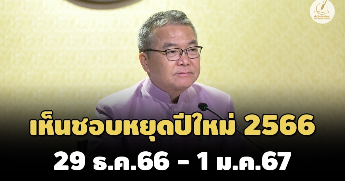 ครม.เห็นชอบวันหยุดช่วงปีใหม่ 66 ยาว 4 วันเริ่มวันที่ 29 ธ.ค. 66 - 1 ม.ค. 67 โดยโยกวันที่ 2 ม.ค. 67 มาหยุดวันที่ 29 ธ.ค. 66 แทน