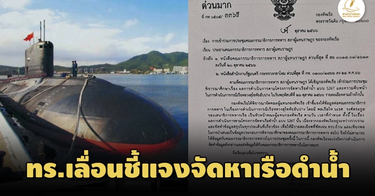 ทร.ร่อนหนังสือถึง กมธ.ทหาร ส.ส. ขอเลื่อนแจงรายละเอียดจัดหาเรือดำน้ำ เผยเหตุผล กำลังอยู่ระหว่างรวบรวมข้อมูล และทำข้อมูลสรุปให้ครบทุกประเด็นจึงยังให้ข้อมูล กมธ.ไม่ได้