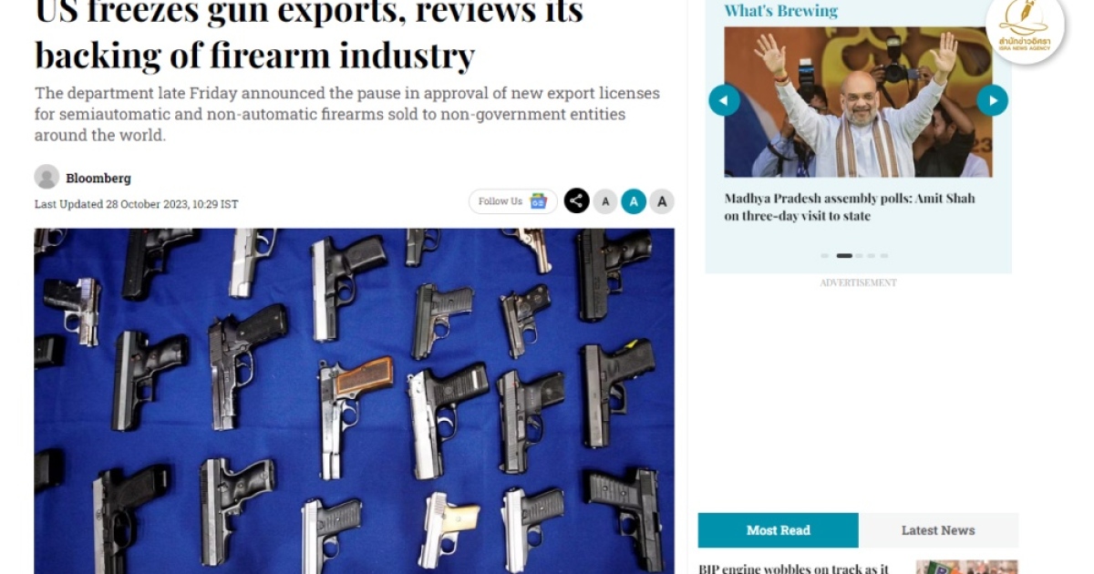 สำนักข่าวอิศรา (www.isranews.org) รายงานข่าวนโยบายการส่งออกอาวุธปืนของสหรัฐอเมริกาที่ส่งผลกระทบมาถึงประเทศไทยว่าเมื่อวันที่ 27 ส.ค.ที่ผ่านมา กระทรวงพาณิชย์สหรัฐฯ ได้ออกคำสั่งระงับการส่งออกอาวุธปืนส่วนใหญ่ที่ผลิตในสหรัฐฯ คิดเป็นเวลา 90 วัน และตอนนี้กำลังทบทวนนโยบายเรื่องการสนับสนุนการค้าปืนครั้งใหญ่ในประเทศว่าจะ ว่าจะ "ไม่บ่อนทําลายผลประโยชน์ด้านนโยบายของสหรัฐฯ" ซึ่งการดำเนินการระงับการส่งออกดังกล่าวนั้นอาจจะเป็นสิ่งที่ชะลอการเติบโตของยอดขายปืนของสหรัฐฯในต่างประเทศเป็นเวลากว่าสองทศวรรษ