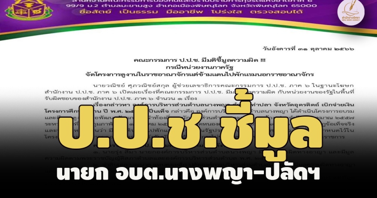 สำนักงาน ป.ป.ช.ภาค 6 แถลงมติคณะกรรมการฯ ชุดใหญ่ ชี้มูลความผิด 'รุ่ง สีมา' นายก อบต.นางพญา อุตรดิตถ์ -พวก 3 ราย เบิกจ่ายเท็จ จัดโครงการดูงานในปท. แต่ข้ามแดนไปพักแรมที่ลาว ไม่มีการขออนุญาต - ปลัดฯ โดนฟันวินัยร้ายแรงด้วย