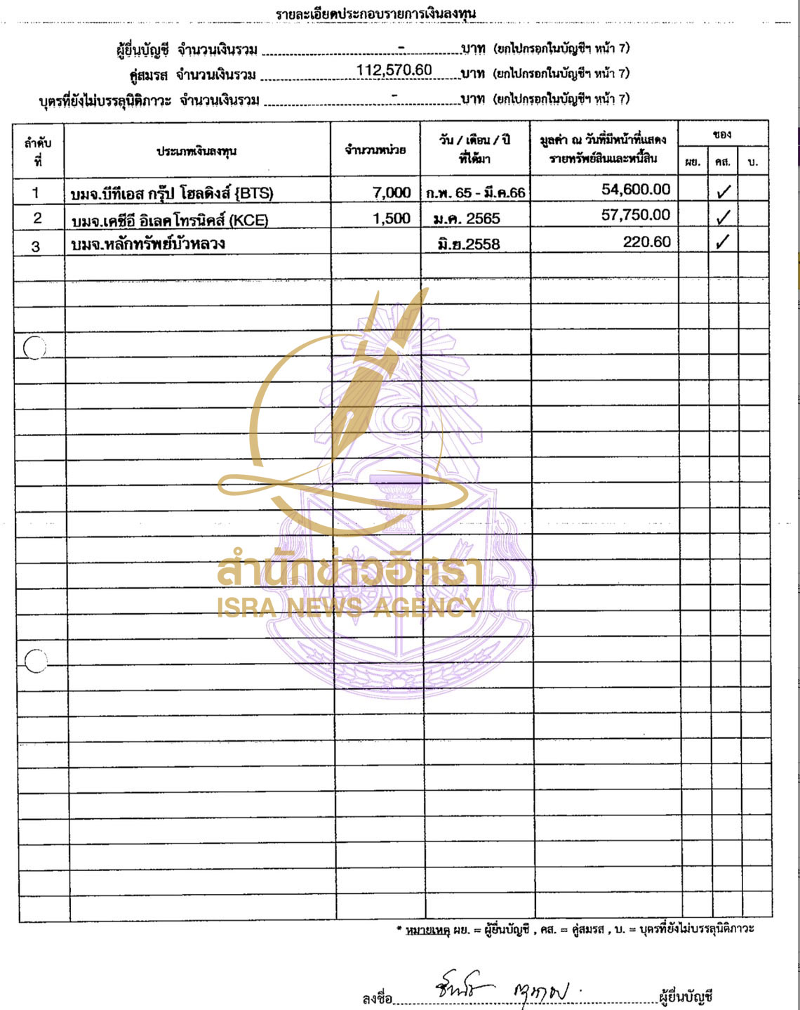 เงินลงทุน 3 รายการ 112,570 บาท เป็น บมจ.บีทีเอส กรุ๊ป โฮลดิงส์ (BTS) มูลค่า 54,600 บาท บมจ.เคซีอี อิเลคโทรนิคส์ (KCE) มูลค่า 57,750 บาท และ บมจ.หลักทรัพย์บัวหลวง มูลค่า 220 บาท