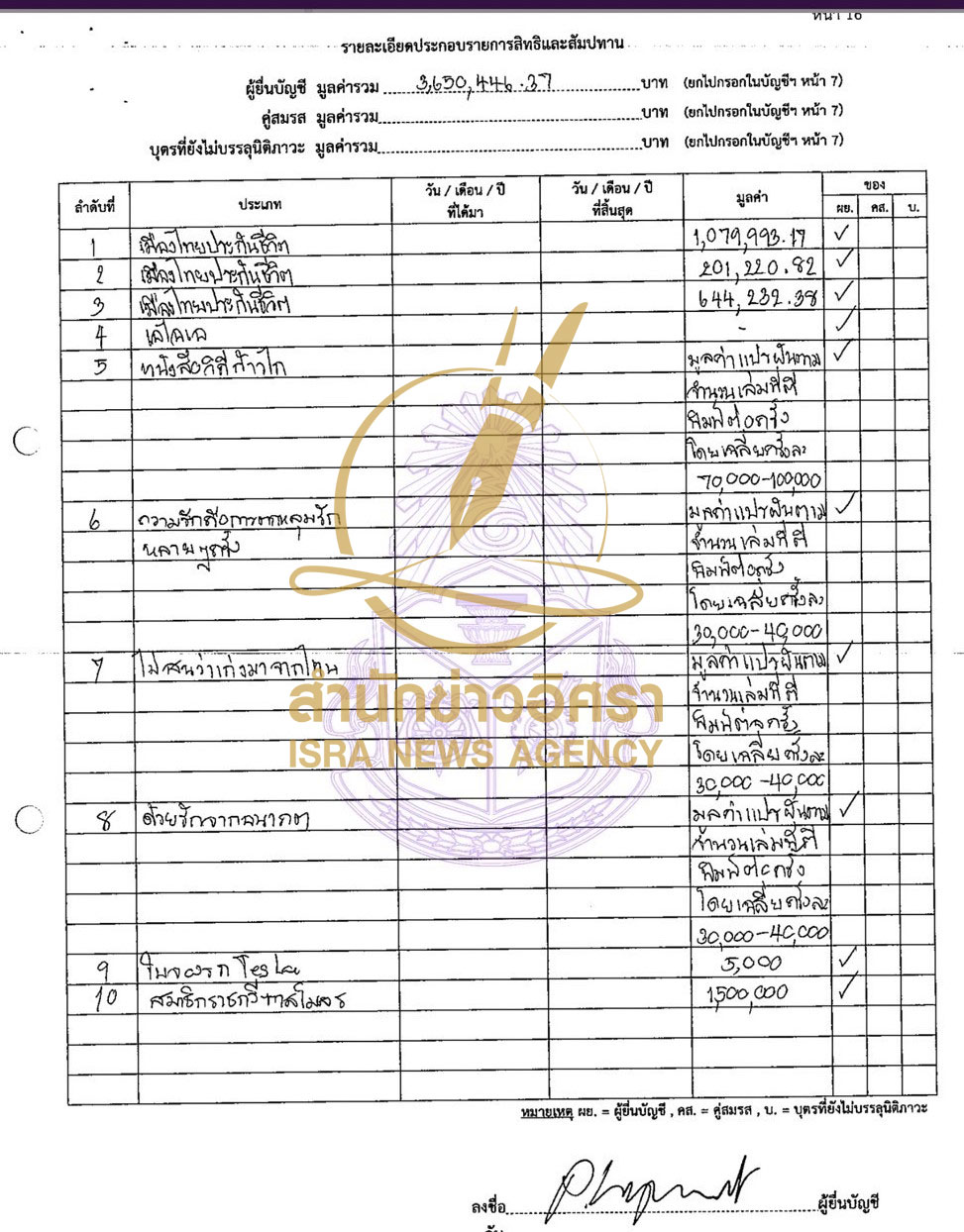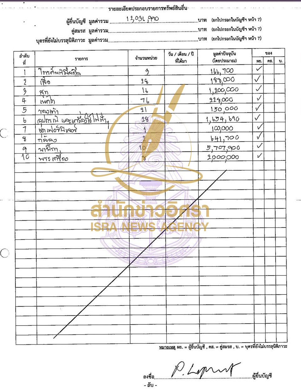 และทรัพย์สินอื่น 12,036,955 บาท อาทิ โทรศัพท์ 3 เครื่อง เสื้อ 28 ตัว สูตร 16 ตัว เนคไท 76 เส้น รองเท้า 21 คู่ อุปกรณ์และเครื่องใช้ไฟฟ้า 28 ชิ้น ชุดเฟอร์นิเจอร์ 1 ชุด นาฬิกา 10 เรือน พระเครื่อง 8 องค์ เป็นต้น