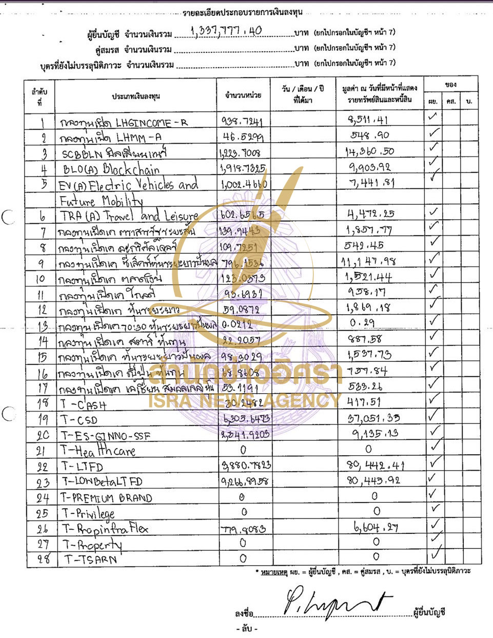 เงินลงทุน 64 รายการ 1,337,777 บาท (อาทิ หุ้นบริษัท ไทยโรจน์ จำกัด และ หุ้น บริษัท พรพนา พลัส จำกัด) เงินให้กู้ยืม 15,000,000 บาท ระบุผู้กู้ยืม นายภาษิณ ลิ้มเจริญรัตน์ น้องชาย กู้ยืมเมื่อวันที่ 15 ธ.ค. 2563