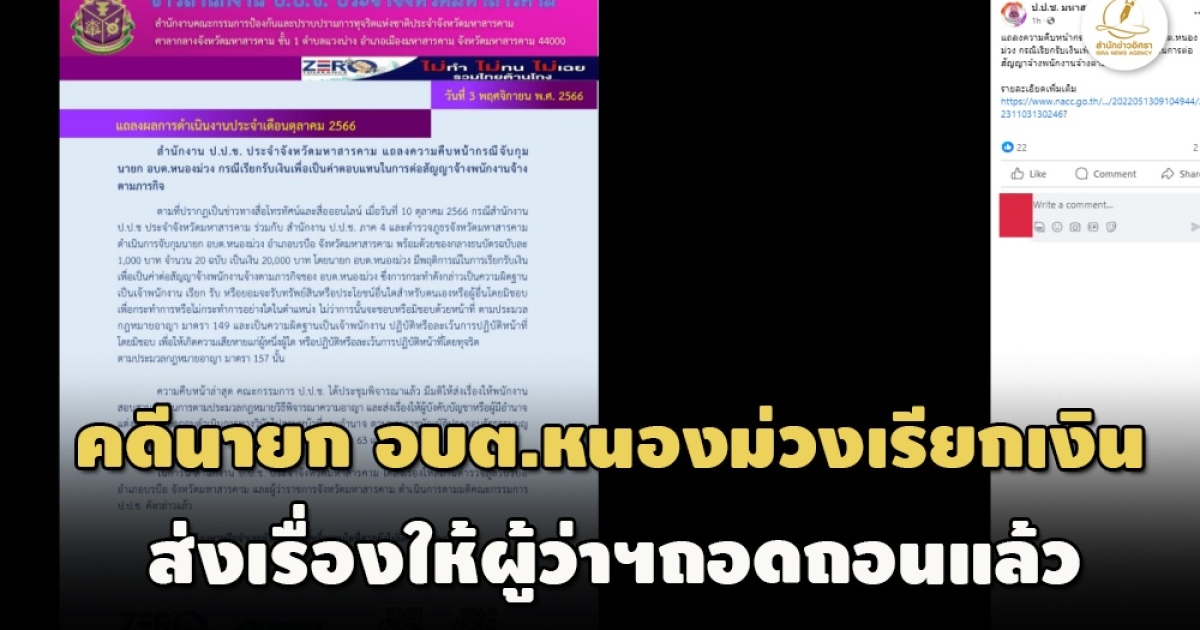 ป.ป.ช.มหาสารคามแจงคืบหน้าสอบคดี นายก อบต.หนองม่วงเรียกเงินต่อสัญญาลูกจ้าง เผยที่ประชุมส่งเรื่องให้ผู้ว่าฯมหาสารคามเดินเรื่องถอดถอนแล้ว