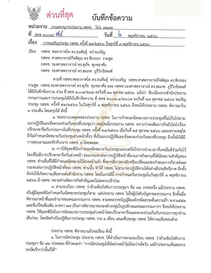 2.กรณีกำหนดนัดประชุมครั้งที่ 22/2566 ในวันศุกร์ที่ 3 พ.ย.2566 โดยมีเหตุผลความจำเป็นอันมิอาจหลีกเสี่ยงได้ เนื่องจากมีวาระเรื่องที่ค้างพิจารณาและเรื่องเสนอพิจารณาเป็นจำนวนมาก โดยมีวาระที่เป็นเรื่องเร่งด่วน เช่น วาระที่ 4.10, 4.11 และ 4.12 รวมทั้งวาระที่มีกำหนดระยะเวลาต้องพิจารณาภายในระยะเวลาที่กำหนด เช่น วาระที่ 5.1 , 5.2, 5.3 ,5.4 ,5.8, 5.9 ,5.10 ,5.11 ,5.19 และ 5.20 ซึ่งมีบางเรื่องที่ล่วงเลยระยะเวลาที่สมควรต้องพิจารณาแล้ว
