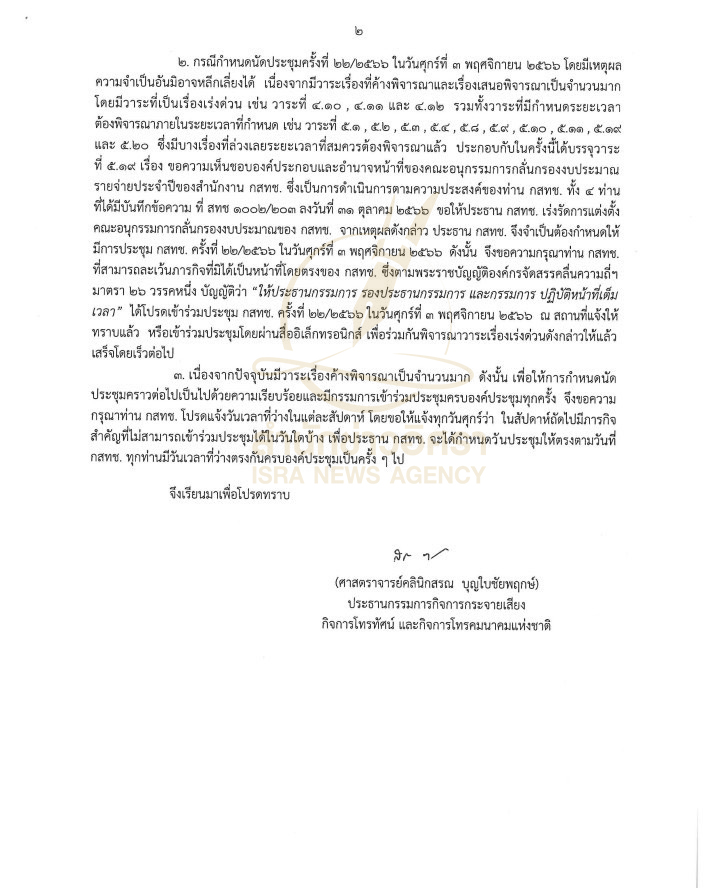 จากเหตุผลดังกล่าว ประธาน กสทช. จึงจำเป็นต้องกำหนดให้มีการประชุม กสทช. ครั้งที่ 22/2566 ในวันศุกร์ที่ 3 พ.ย.2566 ดังนั้น จึงขอความกรุณาท่าน กสทช. ที่สามารถละเวันภารกิจที่มีได้เป็นหน้าที่โดยตรงของ กสทช. ซึ่งตามพระราชบัญญัติองค์กรจัดสรรคลื่นความถี่ฯ มาตรา 26 วรรคหนึ่ง บัญญัติว่า “ให้ประธานกรรมการ รองประธานกรรมการ และกรรมการ ปฏิบัติหน้าที่เต็มเวลา”