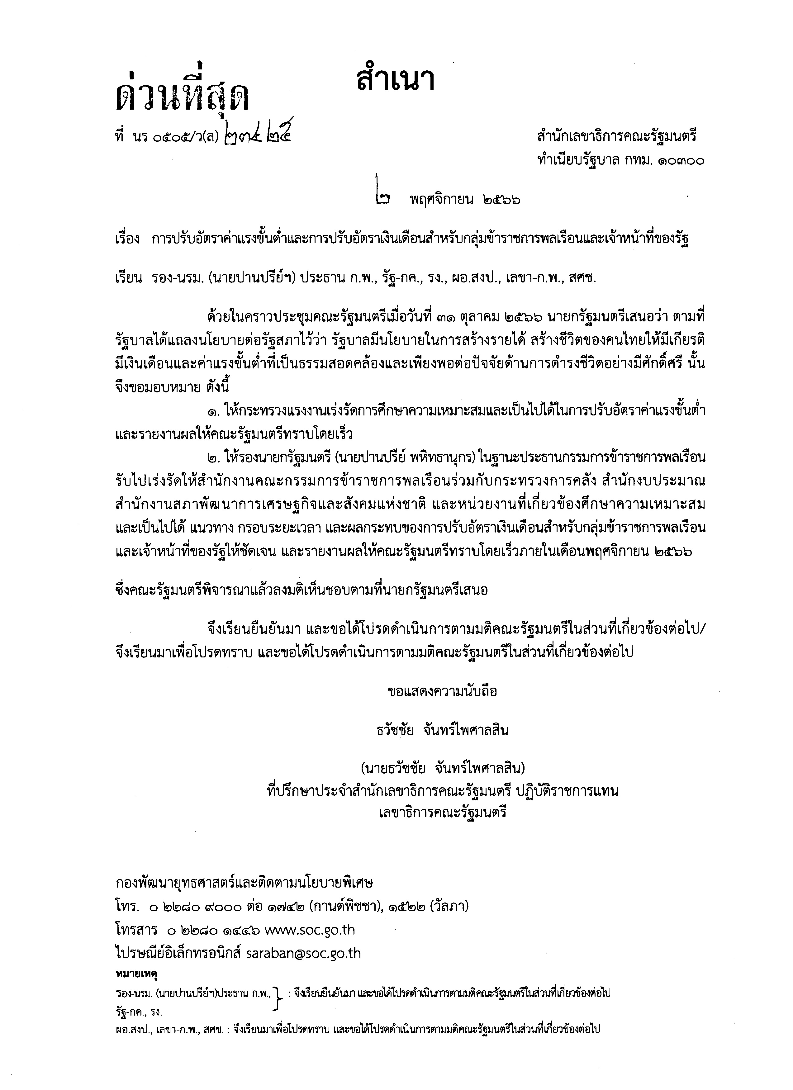 ซึ่งคณะรัฐมนตรีพิจารณาแล้วลงมติเห็นชอบตามที่นายกรัฐมนตรีเสนอ จึงเรียนยืนยันมา และขอได้โปรดดำเนินการตามมติ ครม. ในส่วนที่เกี่ยวข้องต่อไป” หนังสือสำนักเลขาธิการคณะรัฐมนตรี ด่วนที่สุด ที่ นร. 0505/ว (ล) 23425 ลงวันที่ 2 พ.ย.2566 เรื่อง การปรับอัตราค่าแรงขั้นต่ำและการปรับอัตราเงินดือนสำหรับกลุ่มข้าราชการพลเรือนและเจ้าหน้าที่ของรัฐ ระบุ