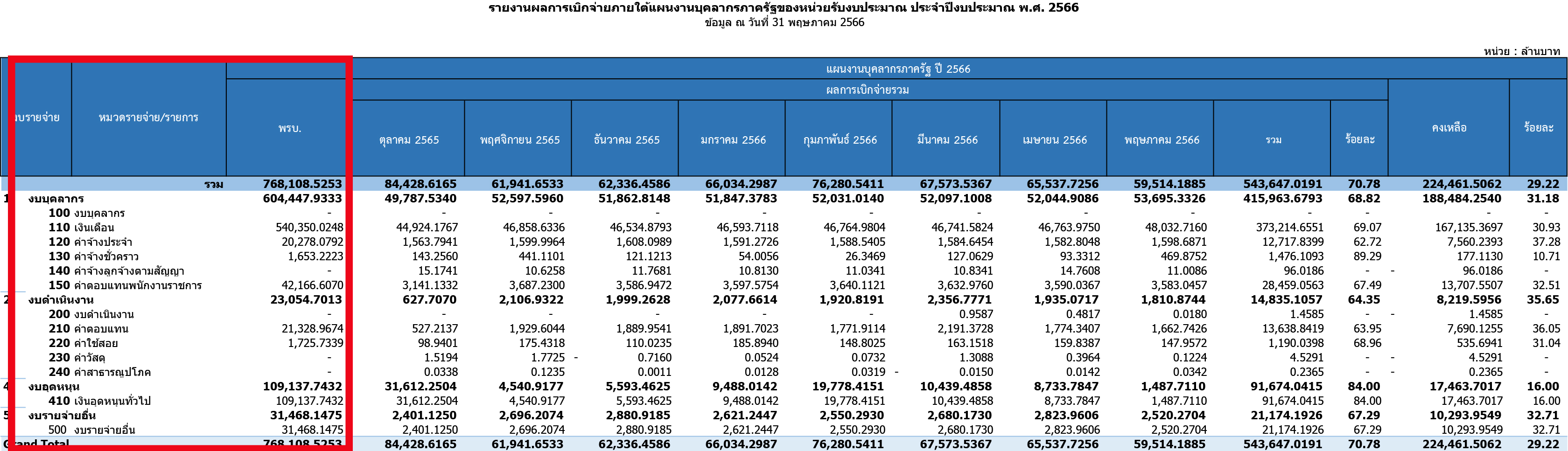 สำนักข่าวอิศรารายงานว่า ภายใต้ พ.ร.บ.งบประมาณรายจ่ายประจำปีงบประมาณ พ.ศ.2566 มีการจัดสรรงบรายจ่ายบุคลากรทั้งสิ้น 768,108.52 ล้านบาท หรือคิดเป็นสัดส่วนประมาณ 24.1% ของวงเงินงบประมาณปีงบ 2566 วงเงิน 3,185,000 ล้านบาท ในจำนวนนี้เป็นงบประเภทเงินเดือน ค่าจ้างประจำ ค่าจ้างชั่วคราว ค่าจ้างลูกจ้างตามสัญญา และค่าตอบแทนพนักงานราชการ รวม 604,447.93 ล้านบาท