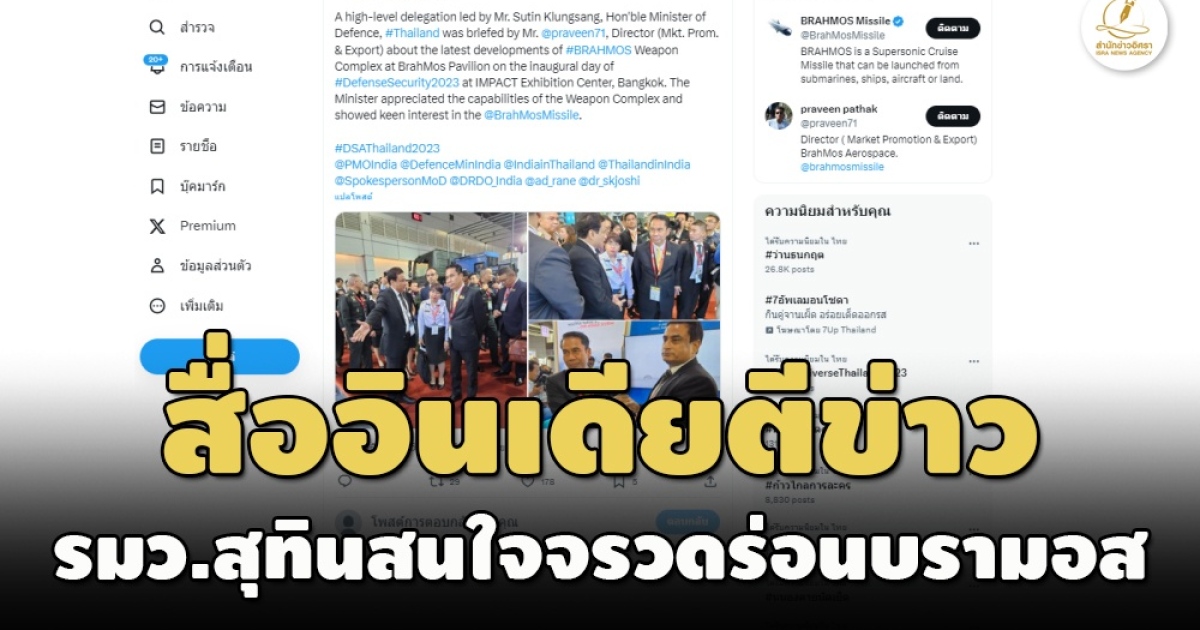 สื่ออินเดียตีข่าว รมว.สุทิน สนใจจรวดร่อนบรามอส หลังร่วมนิทรรศการอาวุธที่อิมแพคฯ เผยไทยเริ่มเจรจาจัดซื้อจรวดตั้งแต่ 'บิ๊กลือ' เป็น ผบ.ทร.แล้ว