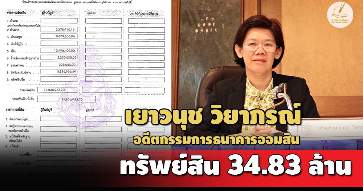ป.ป.ช.เปิดบัญชีทรัพย์สิน เยาวนุช วิยาภรณ์ อดีตกรรมการธนาคารออมสิน มีทรัพย์สิน 34 ล้าน มีเงินฝาก 5 ล้าน ที่ดินใน หนองแขม กทม. รายได้ 1.6 ล./ปี