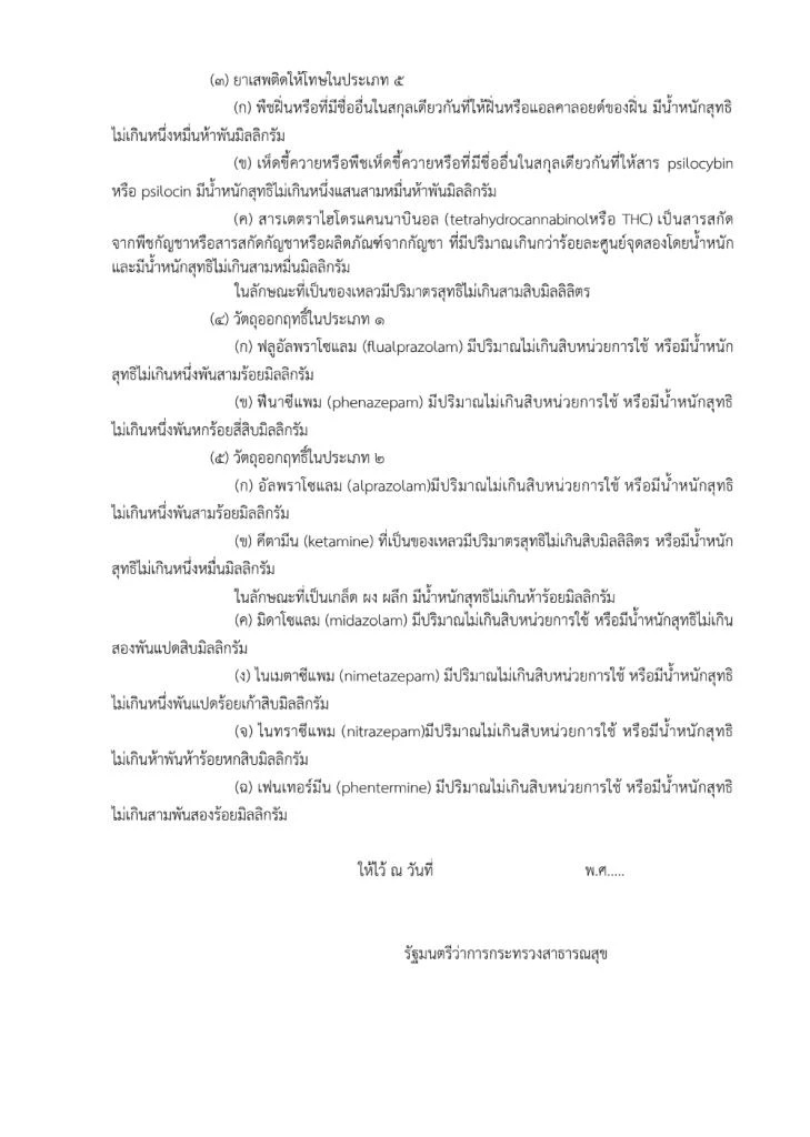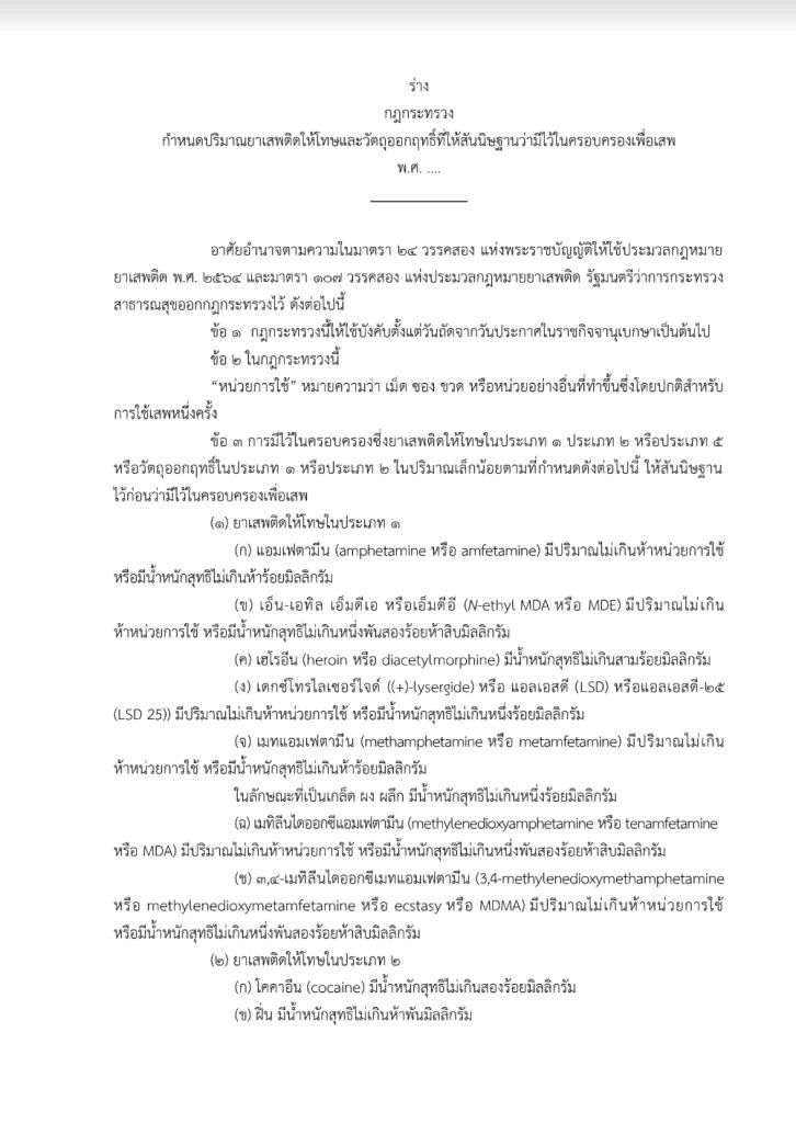 ทั้งนี้ กระทรวงสาธารณสุข (สธ.) ได้เปิดแสดงความคิดเห็นร่างกฎกระทรวงกำหนดปริมาณยาเสพติดให้โทษและวัตถุออกฤทธิ์ที่ให้สันนิษฐานว่ามีไว้ในครอบครองเพื่อเสพ พ.ศ. ... ซึ่งรายละเอียดในร่างกำหนดไว้ 5 กลุ่ม รวม 20 ตัว เช่น แอมเฟตามีน เมทแอมเฟตามีน LSD ซึ่งกำหนดไม่เกิน 5 หน่วยการใช้ เฮโรอีน ไม่เกิน 300 มิลลิกรัม ฝิ่น ไม่เกิน 5 พันมิลลิกรัม โคเคอีน ไม่เกิน 200 มิลลิกรัม เห็นขี้ควาย ไม่เกิน 1.35 แสนมิลลิกรัม สาร THC กัญชา ไม่เกิน 3 หมื่นมิลลิกรัม กลุ่มยานอนหลับ ซึ่งมีหลายตัว ส่วนใหญ่ไม่เกิน 10 หน่วยการใช้ เป็นต้น