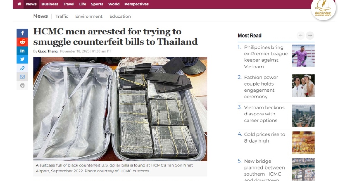 ที่นครโฮจิมินห์ซิตี้ เจ้าหน้าที่ตำรวจได้จับกุมตัวผู้ต้องสงสัยสองรายในฐานความผิดว่าพยายามลักลอบขนธนบัตรปลอมที่ดูเหมือนเงินหนึ่งล้านดอลลาร์สหรัฐฯ (1,379,172,000 บาท) จากท่าอากาศยานนานาชาติเตินเซินเญิ้ตมายังประเทศไทย