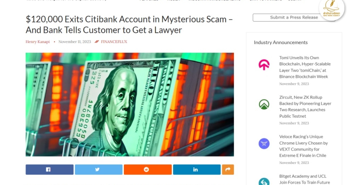 เรียบเรียงจาก:https://dailyhodl.com/2023/11/11/120000-exits-citibank-account-in-mysterious-scam-and-bank-tells-customer-to-get-a-lawyer/
