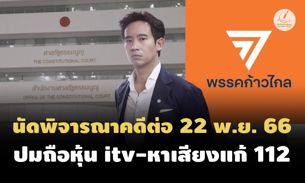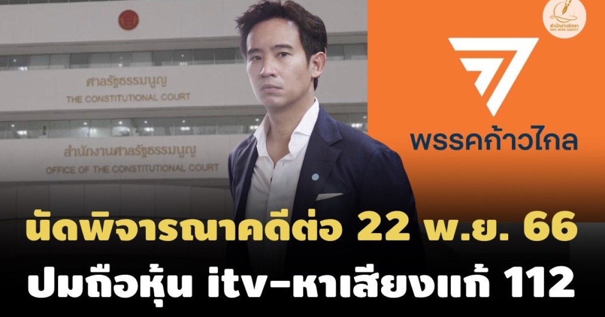 ศาลรัฐธรรมนูญนัดพิจารณา 2 คดี 'พิธา ลิ้มเจริญรัตน์ ถือหุ้น itv ขัดคุณสมบัติเป็นสส.?-หาเสียงแก้ ม.112 ล้มล้างการปกครองหรือไม่' ต่อ ในวันที่ 22 พ.ย. 2566