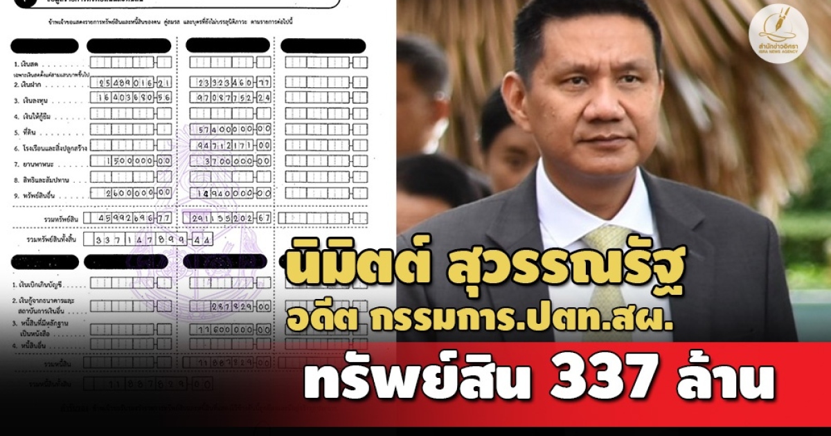 ป.ป.ช.เปิดบัญชีทรัพย์สิน 'พลโท นิมิตต์ สุวรรณรัฐ' คนสนิท บิ๊กตู่ พ้นกรรมการ บริษัท ปตท. สำรวจและผลิตปิโตรเลียม จำกัด (มหาชน) มีทรัพย์สิน 337 ล. มีเงินฝาก 25 ล. รายได้ 11 ล./ปี ภรรยามีที่ดิน 12 แปลงใน กทม. มูลค่า 57 ล.