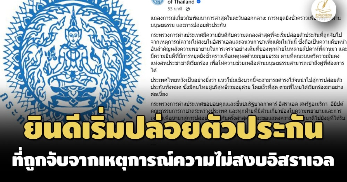 สำนักข่าวอิศรา (www.isranews.org) รายงานว่า เมื่อวันที่ 24 พ.ย. 2566 กระทรวงการต่างประเทศ (กต.) เผยแพร่แถลงการณ์ยินดีกับการเริ่มปล่อยตัวประกันที่ถูกจับไปจากเหตุการณ์ความไม่สงบในอิสราเอลและฉนวนกาซา ผ่านเฟซบุ๊ก กระทรวงการต่างประเทศ Ministry of Foreign Affairs of the Kingdom of Thailand มีรายละเอียด ดังนี้