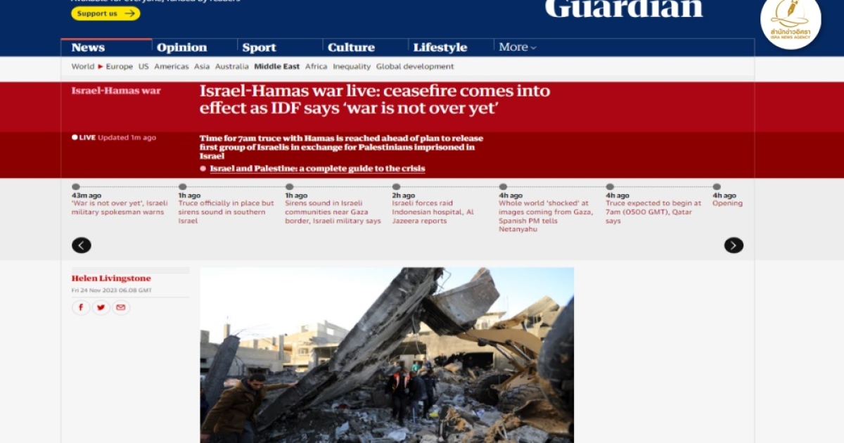 อิสราเอล-ฮามาสประกาศพักรบทางการแล้วเป็นเวลา 4 วัน แต่ยังคงมีเสียงไซเรนเตือนจรวดดังที่ชุมชนอิสราเอลใกล้กับฉนวนกาซาหลังหยุดยิงแล้ว 40 นาที คาดพักรบ 4 วัน ปล่อยตัวประกันได้อย่างน้อย 50 คน ลุ้นตัวประกันไทย 23 คนจะถูกปล่อยตัวหรือไม่