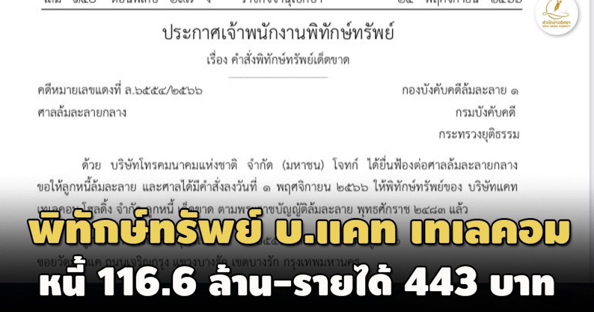 ด้วย บริษัทโทรคมนาคมแห่งชาติ จํากัด (มหาชน) โจทก์ ได้ยื่นฟ้องต่อศาลล้มละลายกลาง ขอให้ลูกหนี้ล้มละลาย และศาลได้มีคําสั่งลงวันที่ 1 พฤศจิกายน 2566 ให้พิทักษ์ทรัพย์ของ บริษัทแคท เทเลคอม โฮลดิ้ง จํากัด ลูกหนี้ เด็ดขาด ตามพระราชบัญญัติล้มละลาย พุทธศักราช 2483 แล้ว