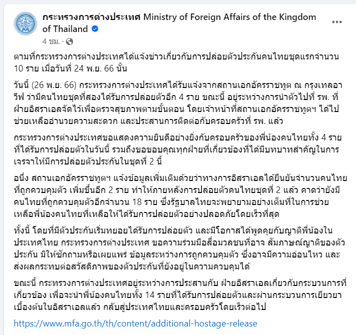 วันนี้ (26 พ.ย. 66) กระทรวงการต่างประเทศได้รับแจ้งจากสถานเอกอัครราชทูต ณ กรุงเทลอาวีฟ ว่ามีคนไทยชุดที่สองได้รับการปล่อยตัวอีก 4 ราย ขณะนี้ อยู่ระหว่างการนำตัวไปที่ รพ. ที่ฝ่ายอิสราเอลจัดไว้เพื่อตรวจสุขภาพตามขั้นตอน โดยเจ้าหน้าที่สถานเอกอัครราชทูตฯ ได้ไปช่วยเหลืออำนวยความสะดวก และประสานการติดต่อกับครอบครัวที่ รพ. แล้ว