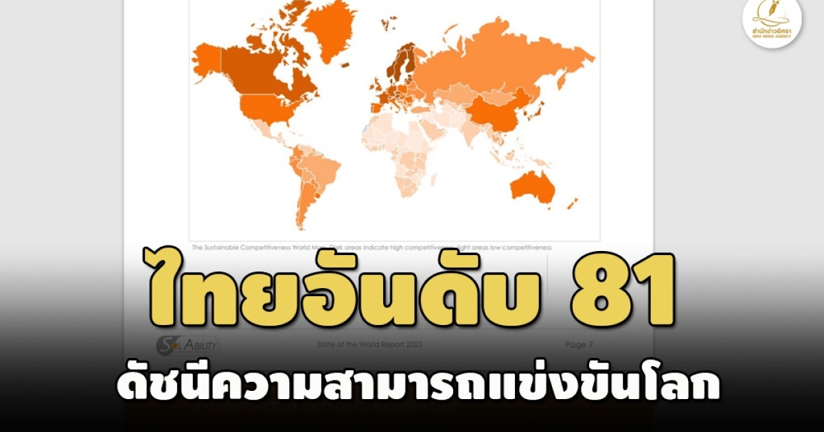 สำนักข่าวอิศรา (www.isranews.org) รายงานว่าสถาบันSolAbility ที่ตั้งอยู่ในประเทศเกาหลีใต้ ได้มีการเผยแพร่ดัชนีความสามารถในการแข่งขันอย่างยั่งยืน (Global Sustainable Competitiveness Index)ประจำปี 2566 เมื่อช่วงเดือน พ.ย.ที่ผ่านมา โดยประเทศไทยพบว่าอยู่ในอันดับที่ 81 จาก 180 ประเทศทั่วโลกที่ได้มีการจัดอันดับ และประเทศไทยมีคะแนนอยู่ที่ 43.6 คะแนน