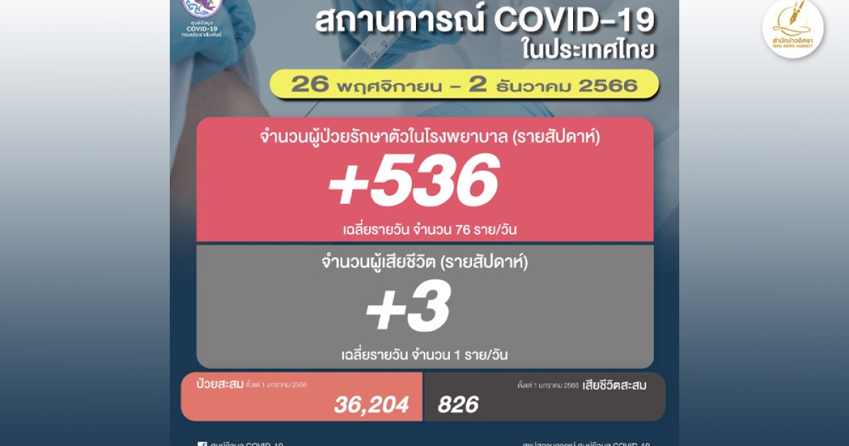สำนักข่าวอิศรา (www.isranews.org) รายงานสถานการณ์แพร่ระบาดของโรคโควิด-19 ประเทศไทย ประจำสัปดาห์ ระหว่างวันที่ 25 พฤศจิกายน - 2 ธันวาคม 2566 มีจำนวนผู้ติดเชื้อใหม่เข้ารักษาตัวโรงพยาบาล 536 ราย เฉลี่ยวันละ 76 ราย ทำให้จำนวนผู้ติดเชื้อสะสมอยู่ที่ 36,204 ราย (ตั้งแต่ 1 ม.ค. 2566)