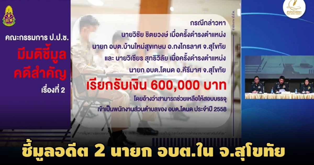 ป.ป.ช.ชี้มูลอดีต 2 นายก อบต.ใน จ.สุโขทัย ร่วมกันเรียกทรัพย์เหยื่อเมื่อปี 58 อ้างช่วยให้เป็น พนง.อบต.โตนดได้ จนบิดาเหยื่อหลงเชื่อโอนเงิน 7 ครั้งรวมกว่า 6 แสนบาท