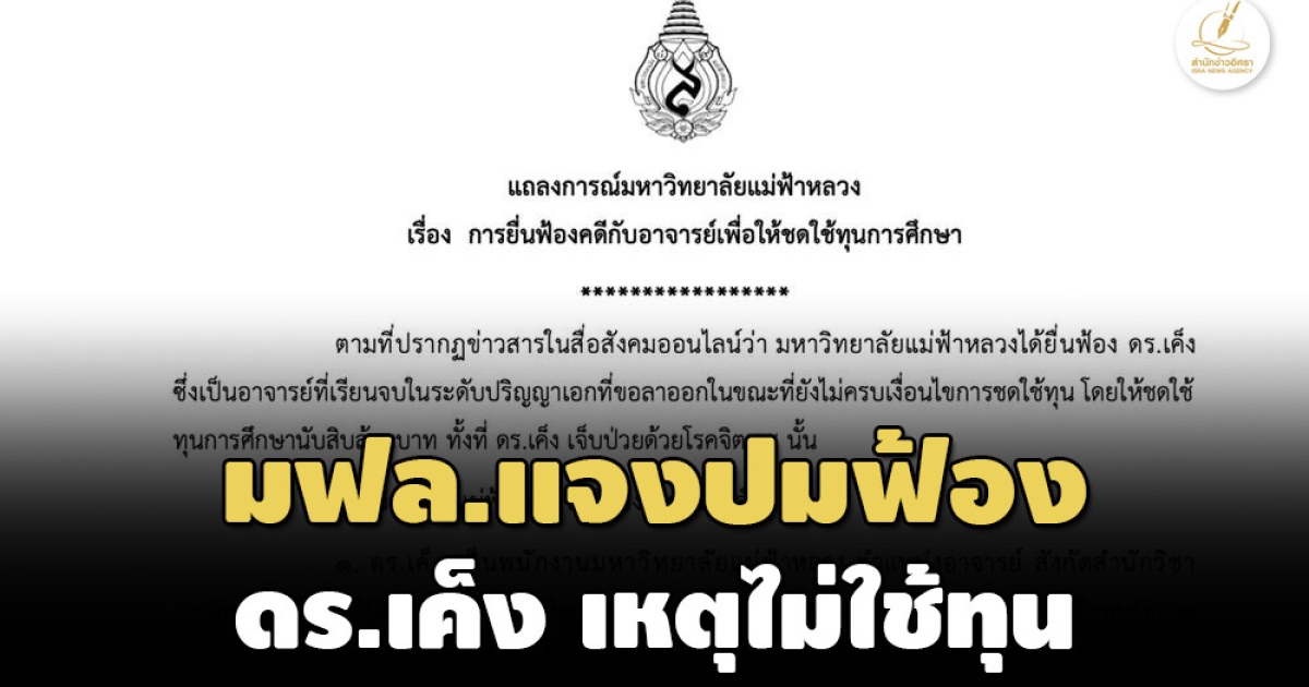 ม.แม่ฟ้าหลวง ออกแถลงการณ์แจงปมฟ้อง ดร.เค็ง เรียกชดใช้ทุน 10 ล้านบาท ยันทำตามหลักเกณ์กฎหมาย-ระเบียบราชการ ชี้คดีอยู่ในระหว่างการพิจารณาศาลปกครองสูงสุด จึงไม่สามารถไกลเกลี่ยได้