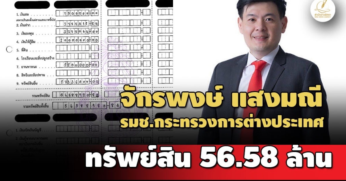 ป.ป.ช. เปิดบัญชีทรัพย์สิน 'จักรพงษ์ แสงมณี' รมช.การต่างประเทศ มีทรัพย์สิน 56 ล. เงินสด 1.5 ล. เงินให้กู้ยืม 20,000,000 บาท สะสมนาฬิกาหรู ทองคำ พระสมเด็จ รายได้ 1.3 ล./ปี