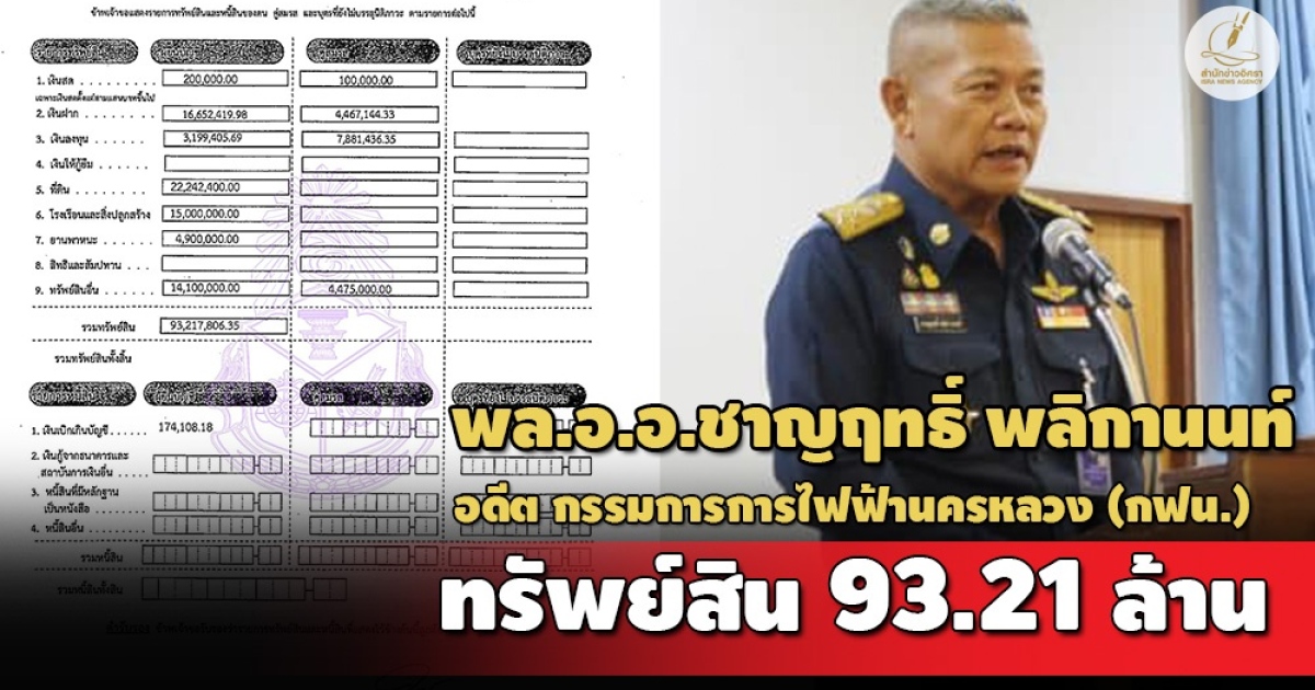 ป.ป.ช.เปิดบัญชีทรัพย์สิน 'พล.อ.อ.ชาญฤทธิ์ พลิกานนท์' พ้นตำแหน่ง กรรมการการไฟฟ้านครหลวง (กฟน.) มีทรัพย์สิน 93 ล. มีรถยนต์ 4 คัน นาฬิกา 8 เรือน พระเครื่อง 239 องค์ ทองคำแท่ง 99.99% 3 กิโลกรัม รายได้ 1.8 ล./ปี