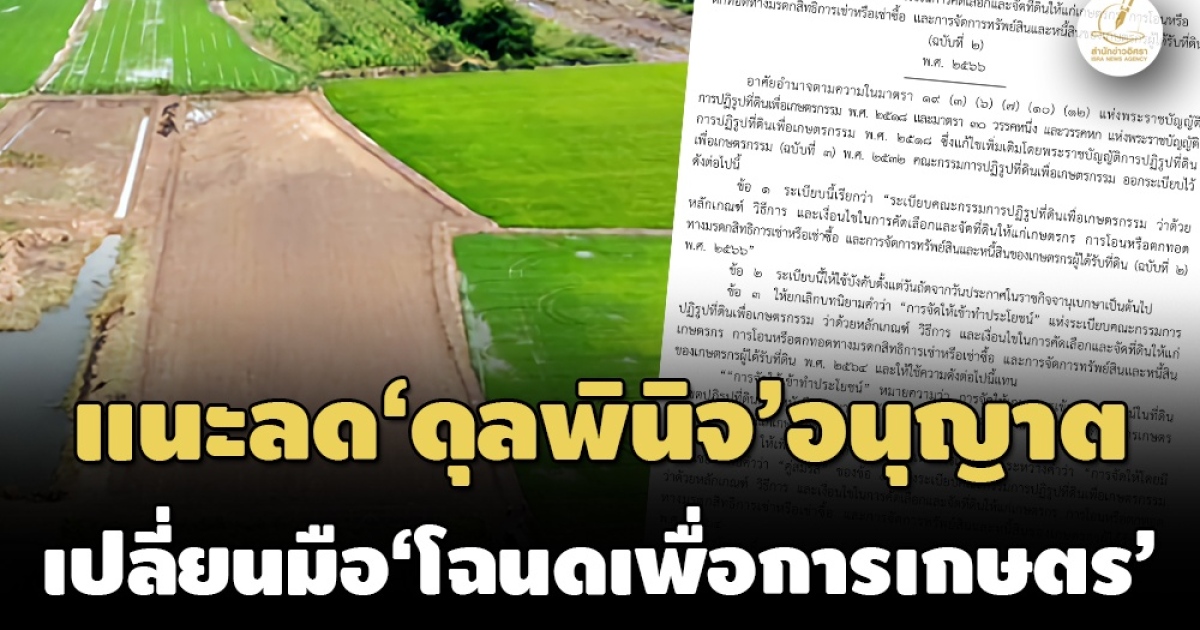 จากกรณีที่เมื่อวันที่ 8 ธ.ค.ที่ผ่านมา เว็บไซต์ราชกิจจานุเบกษาได้เผยแพร่ระเบียบคณะกรรมการปฏิรูปที่ดินเพื่อเกษตรกรรม (คปก.) จำนวน 2 ฉบับ ซึ่งกำหนดหลักเกณฑ์ วิธีการ และเงื่อนไขเกี่ยวกับการปรับปรุงสิทธิ ส.ป.ก. 4-01 เป็นโฉนดเพื่อการเกษตร โดยสำนักงาน ส.ป.ก. จะเร่งรัดการออกโฉนดเพื่อการเกษตร และแจกโฉนดฯตั้งแต่วันที่ 15 ม.ค.2567 นั้น (อ่านประกอบ : มีผลแล้ว! ราชกิจจาฯแพร่ระเบียบฯเปลี่ยน‘ส.ป.ก.4-01’เป็น‘โฉนดฯ’-เปิดทางซื้อขายเปลี่ยนมือได้)