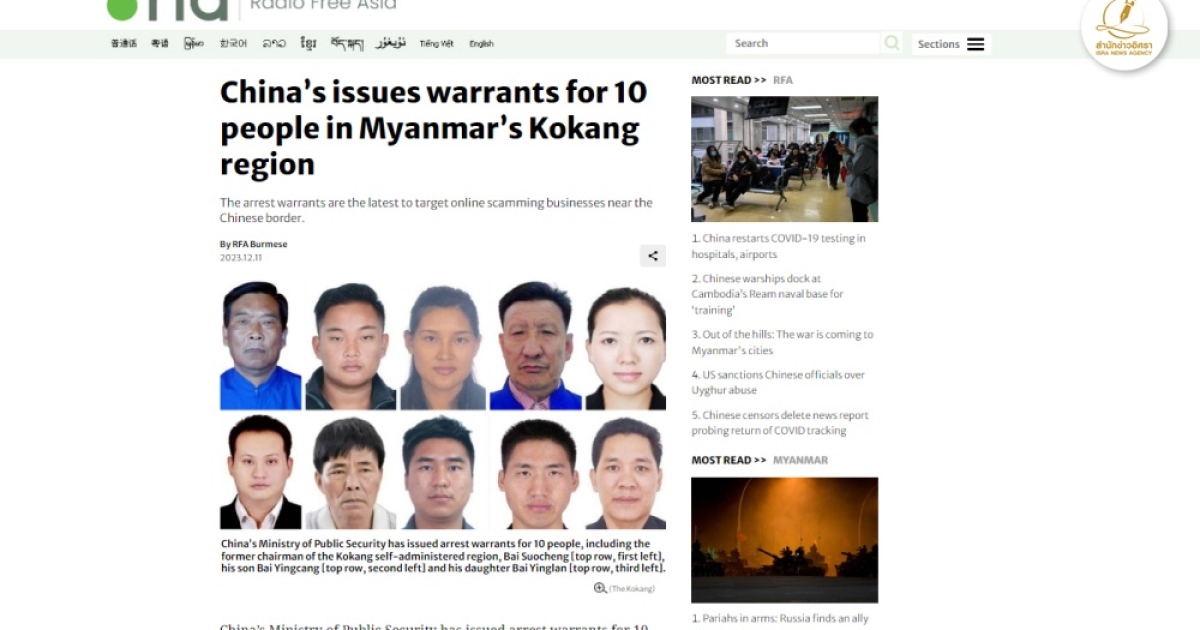 สำนักข่าวอิศรา (www.isranews.org) รายงานสถานการณ์เกี่ยวกับการฉ้อโกงหลอกลวงโดยอ้างอิงข่าวจากสำนักข่าวเรดิโอฟรีเอเชียของสหรัฐอเมริกาว่าเมื่อวันที่ 12 ธ.ค. กระทรวงความมั่นคงสาธารณะของจีนได้ออกหมายจับบุคคล 10 คนที่ถูกกล่าวหาว่ามีส่วนเกี่ยวข้องกับธุรกิจหลอกลวงออนไลน์ในเขตปกครองตนเองโกก้างซึ่งอยุ่ทางตอนเหนือรัฐฉาน ประเทศเมียนมา