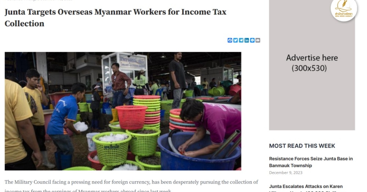 สำนักข่าวอิศรา (www.isranews.org) รายงานข่าวสถานการณ์ในประเทศเมียนมาที่เชื่อมโยงมาถึงประเทศไทยว่าสำนักข่าว BNI Online ได้รายงานข่าวว่าสภากองทัพเมียนมาที่กำลังถูกกดดันอย่างหนักในการจะหาเงินสกุลต่างประเทศ ได้มีการเพิ่มมาตรการการจัดเก็บภาษีของแรงงานเมียนมาที่ทำงานในต่างประเทศ โดยมาตรการนี้มีผลตั้งแต่สัปดาห์ที่ผ่านมา
