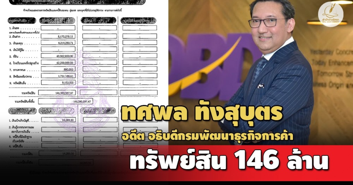 ป.ป.ช. เปิดบัญชีทรัพย์สิน 'ทศพล ทังสุบุตร' พ้นอธิบดีกรมพัฒนาธุรกิจการค้า ทรัพย์สินกว่า 146 ล้าน มีที่ดิน 15 แปลงมูลค่า 60 ล้าน สะสมนาฬิกา-พระเครื่อง-เฟอร์นิเจอร์เก่า ถ้วย ชาม แจกัน รายได้ 2.4 ล้านต่อปี