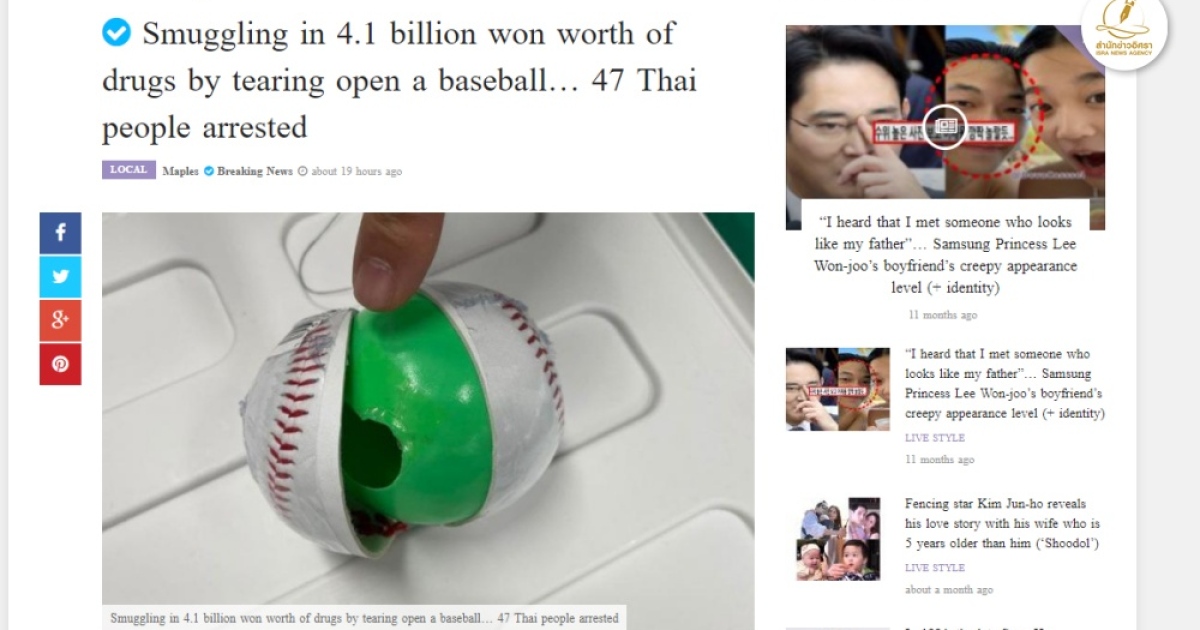สำนักข่าวอิศรา (www.isranews.org) รายงานข่าวยาเสพติดในต่างประเทศที่เกี่ยวข้องกับประเทศไทยว่าเมื่อวันที่ 18 ธ.ค.ที่ผ่านมา มีรายงานว่าเจ้าหน้าที่ตำรวจ สำนักงานตำรวจคยองบุก จังหวัดคย็องซังเหนือ ประเทศเกาหลีใต้ ได้จับกุมชาวไทยจำนวน47 คน ในฐานความผิดลักลอและแจกจำหน่ายยาบ้ามีมูลค่ากว่า 4.1 พันล้านวอน (109,800,635 บาท) โดยยาบ้าจำนวนดังกล่าวนั้นถูกซุกซ่อนและลักลอบเข้ามาในรูปแบบของลูกเบสบอล โดยใช้วิธีการเย็บเอาใส้ในลูกเบสบอลออกแล้วเอายาเสพติดยัดเข้าไปแทน