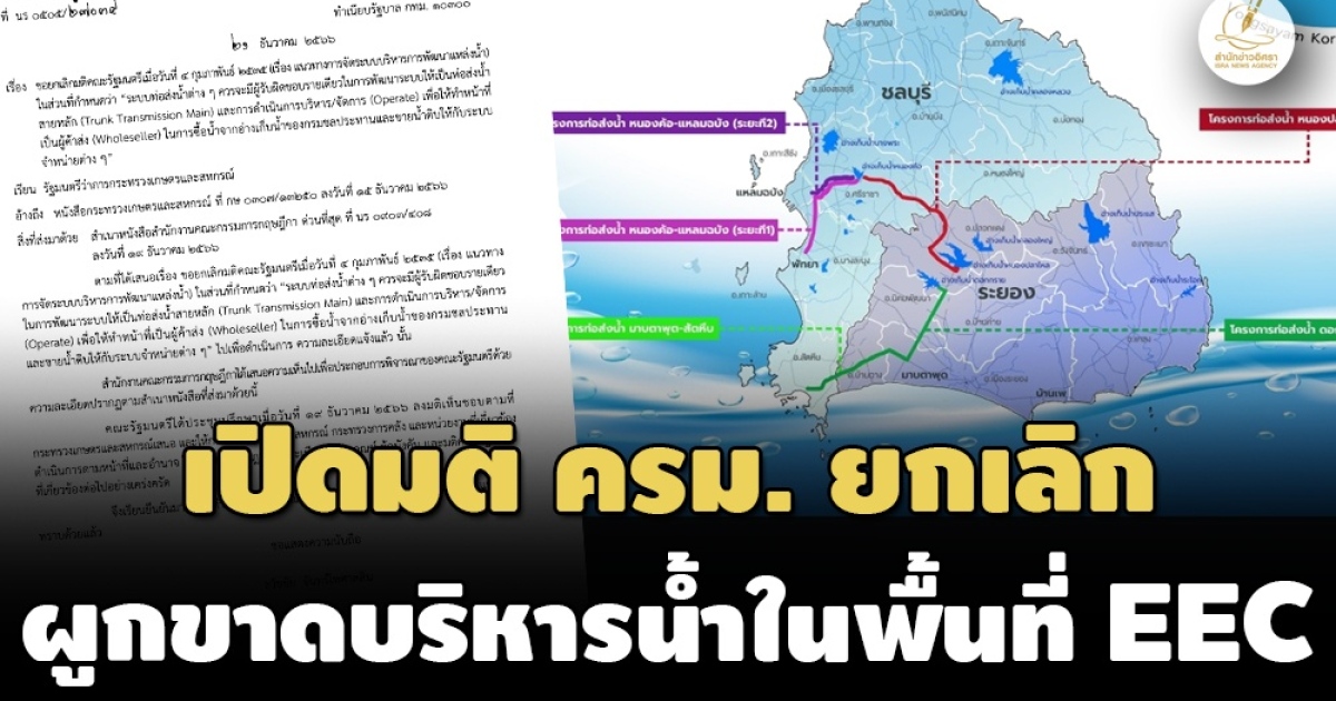เปิดมติ ครม. ไฟเขียวยกเลิก ‘ผูกขาด’ บริหารจัดการน้ำในพื้นที่ EEC เปิดทาง ‘วงษ์สยามก่อสร้างฯ’ คู่สัญญาโครงการท่อส่งน้ำฯ กับ ‘ธนารักษ์’ ซื้อน้ำดิบจาก ‘กรมชลประทาน’ มาขายให้ผู้ต้องการใช้น้ำ