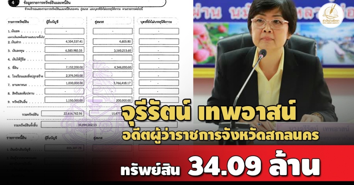ป.ป.ช. เปิดบัญชีทรัพย์สิน 'จุรีรัตน์ เทพอาสน์' อดีตผู้ว่าราชการจังหวัดสกลนคร มีทรัพย์สินกว่า 34 ล้าน มีบ้าน 3 หลัง ทองรูปพรรณ-เครื่องประดับเพชร รายได้ 1.4 ล./ปี