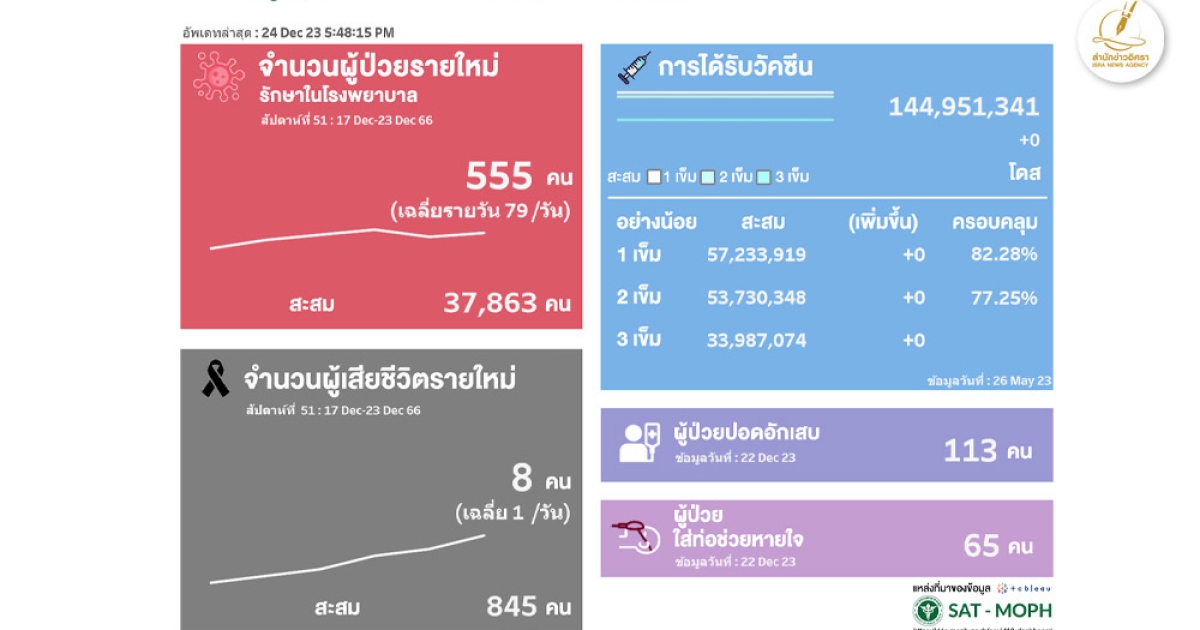 สำนักข่าวอิศรา (www.isranews.org) รายงานสถานการณ์แพร่ระบาดของโรคโควิด-19 ประเทศไทย ประจำสัปดาห์ ระหว่างวันที่ 17 - 23 ธันวาคม 2566 มีจำนวนผู้ติดเชื้อใหม่เข้ารักษาตัวโรงพยาบาล 555 ราย เฉลี่ยวันละ 79 ราย ทำให้จำนวนผู้ติดเชื้อสะสมอยู่ที่ 37,863 ราย (ตั้งแต่ 1 ม.ค. 2566)
