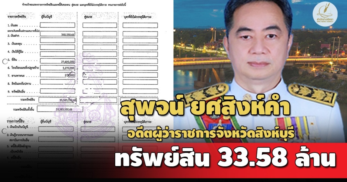 ป.ป.ช. เปิดบัญชีทรัพย์สิน 'สุพจน์ ยศสิงห์คำ' อดีตผู้ว่าราชการจังหวัดสิงห์บุรี มีทรัพย์สินกว่า 33 ล. ที่ดิน 12 แปลง รถยนต์ 2 คัน รายได้ 1.2 ล./ปี